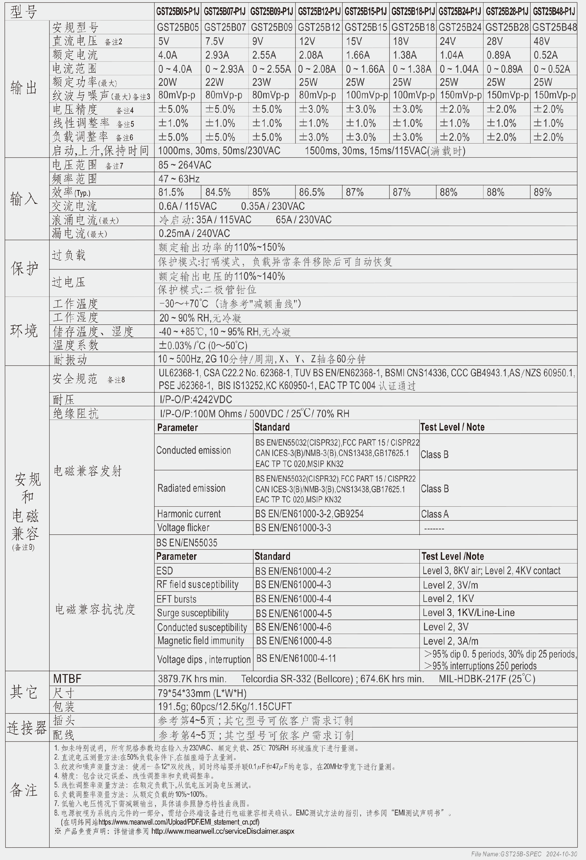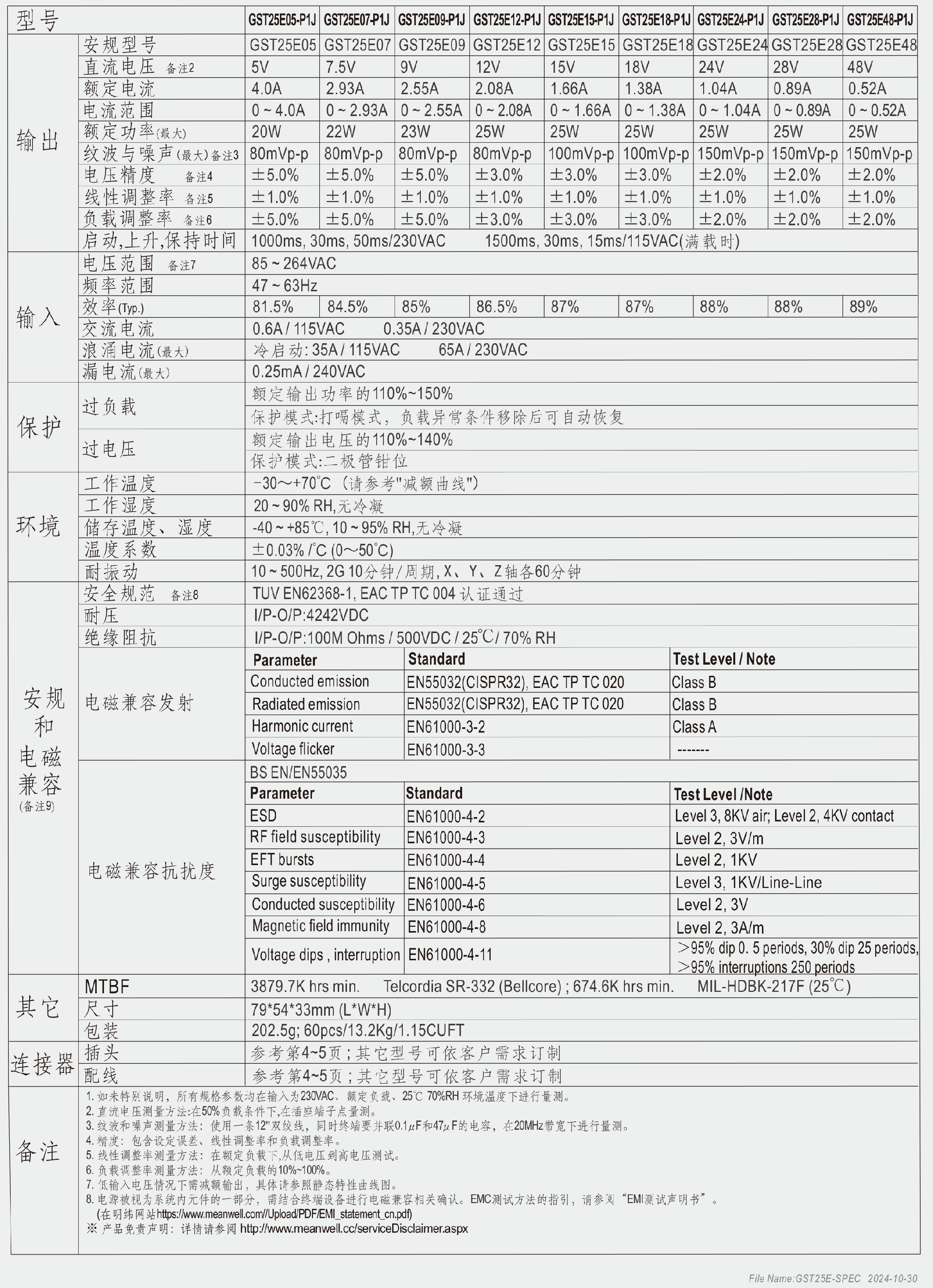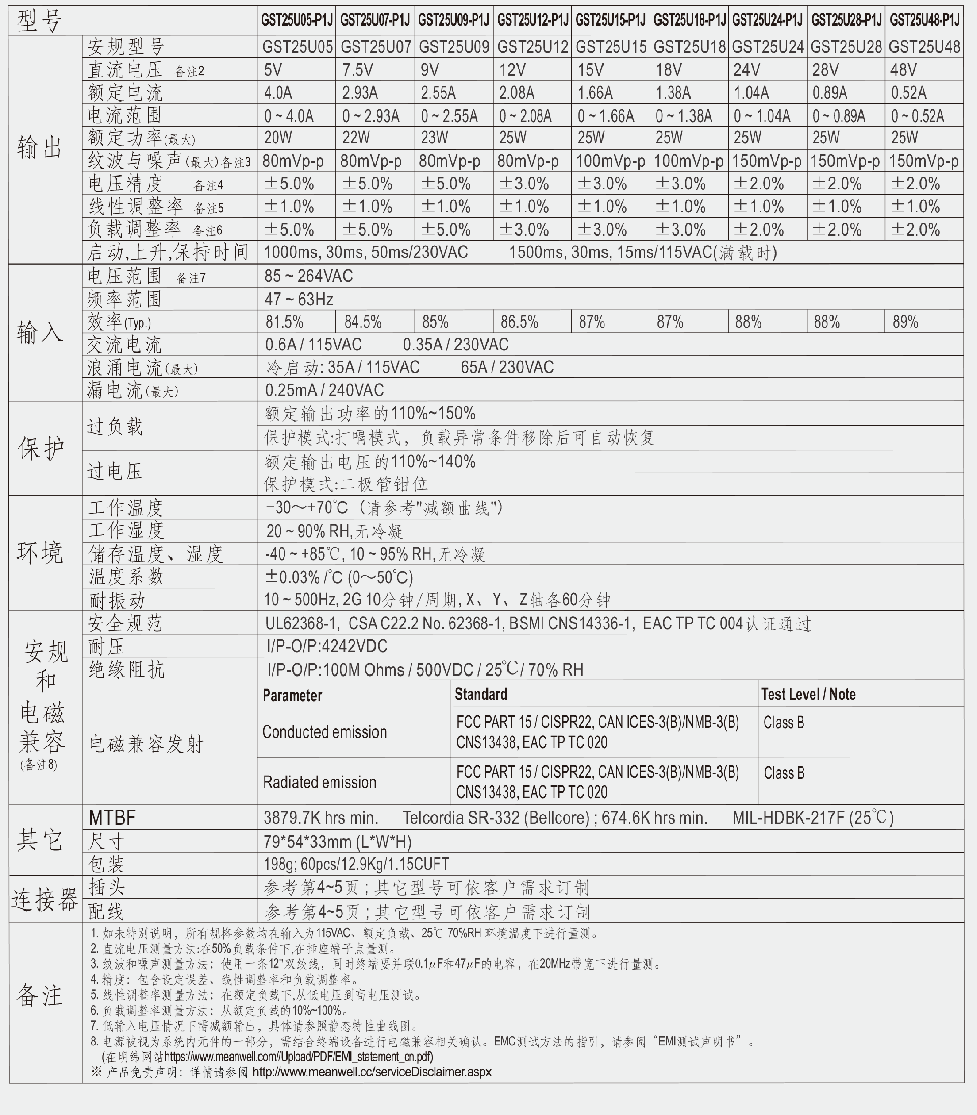 .GST25A:3極交流IEC320-C14輸入接口,ClassⅠ電源;GST25B:2極交流IEC320-C8輸入接口,Class Ⅱ電源;GST25E:2極歐式插頭,Class Ⅱ 電源;GST24U:2極美式插頭,Class Ⅱ 電源