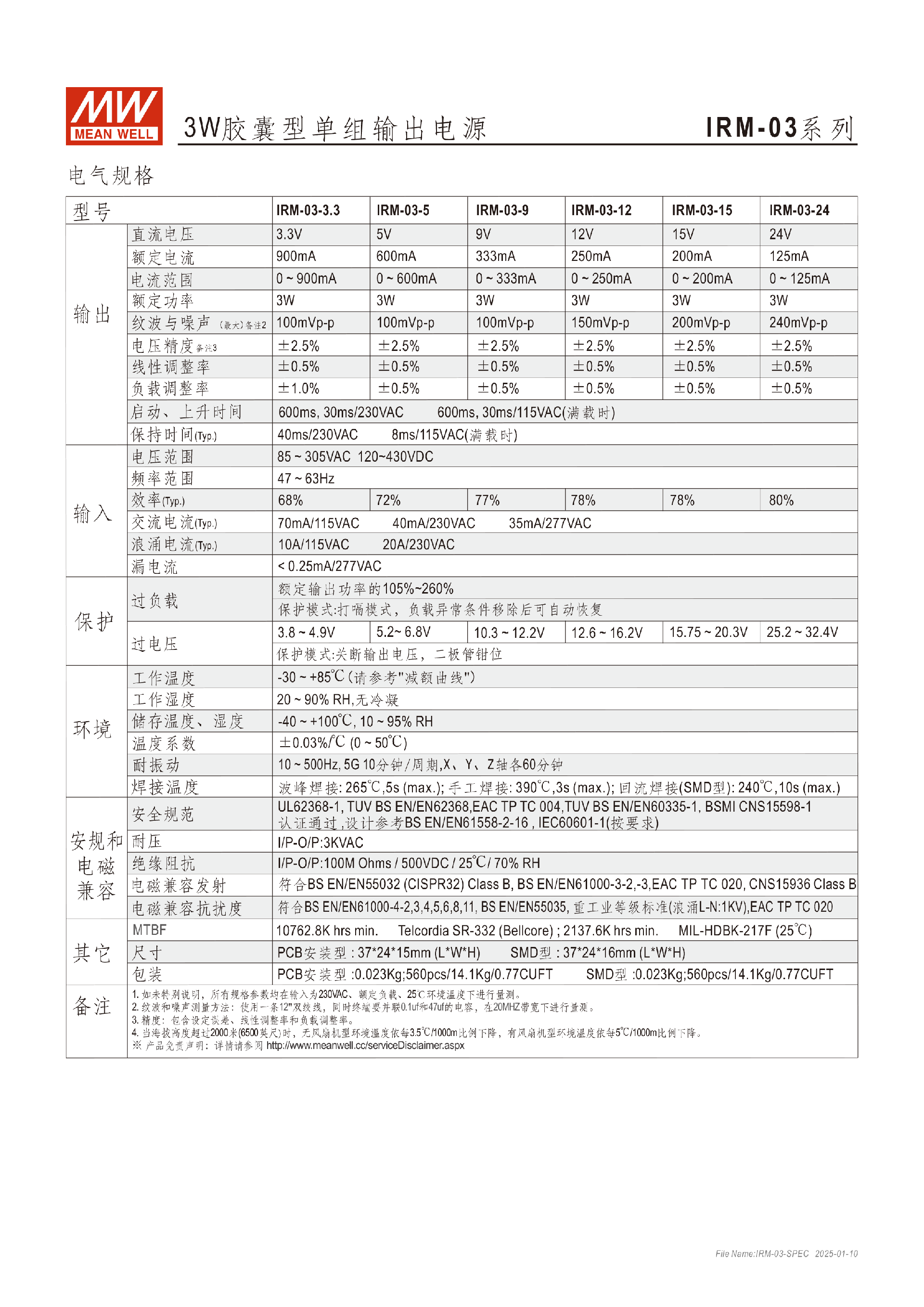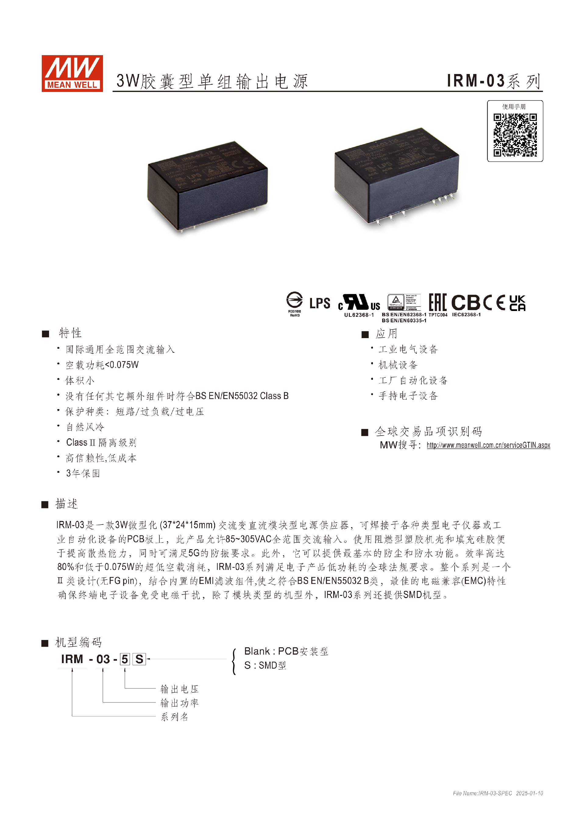 明緯IRM-01系列1W模塊型電源