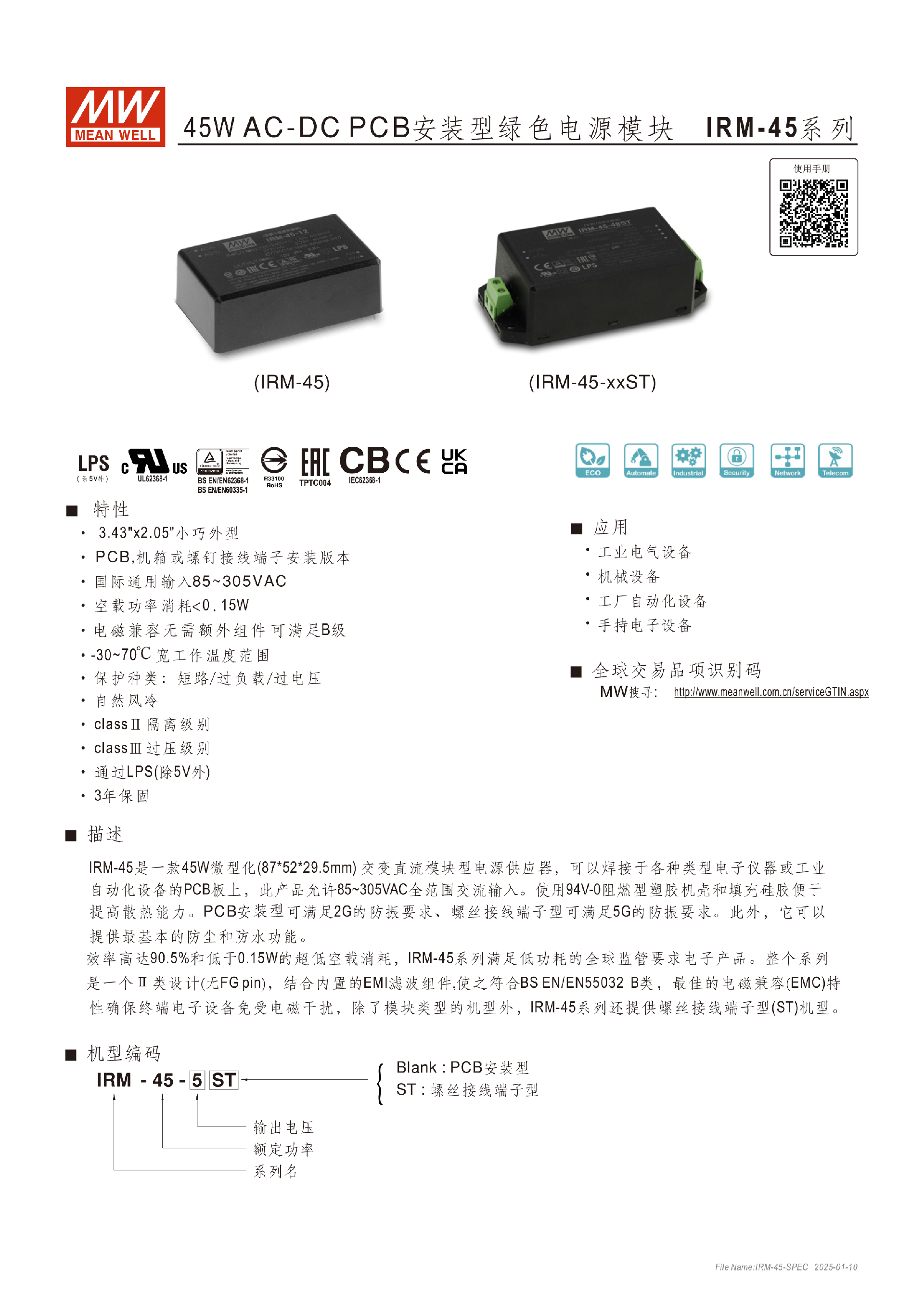 明緯IRM-60系列60W膠囊型電源